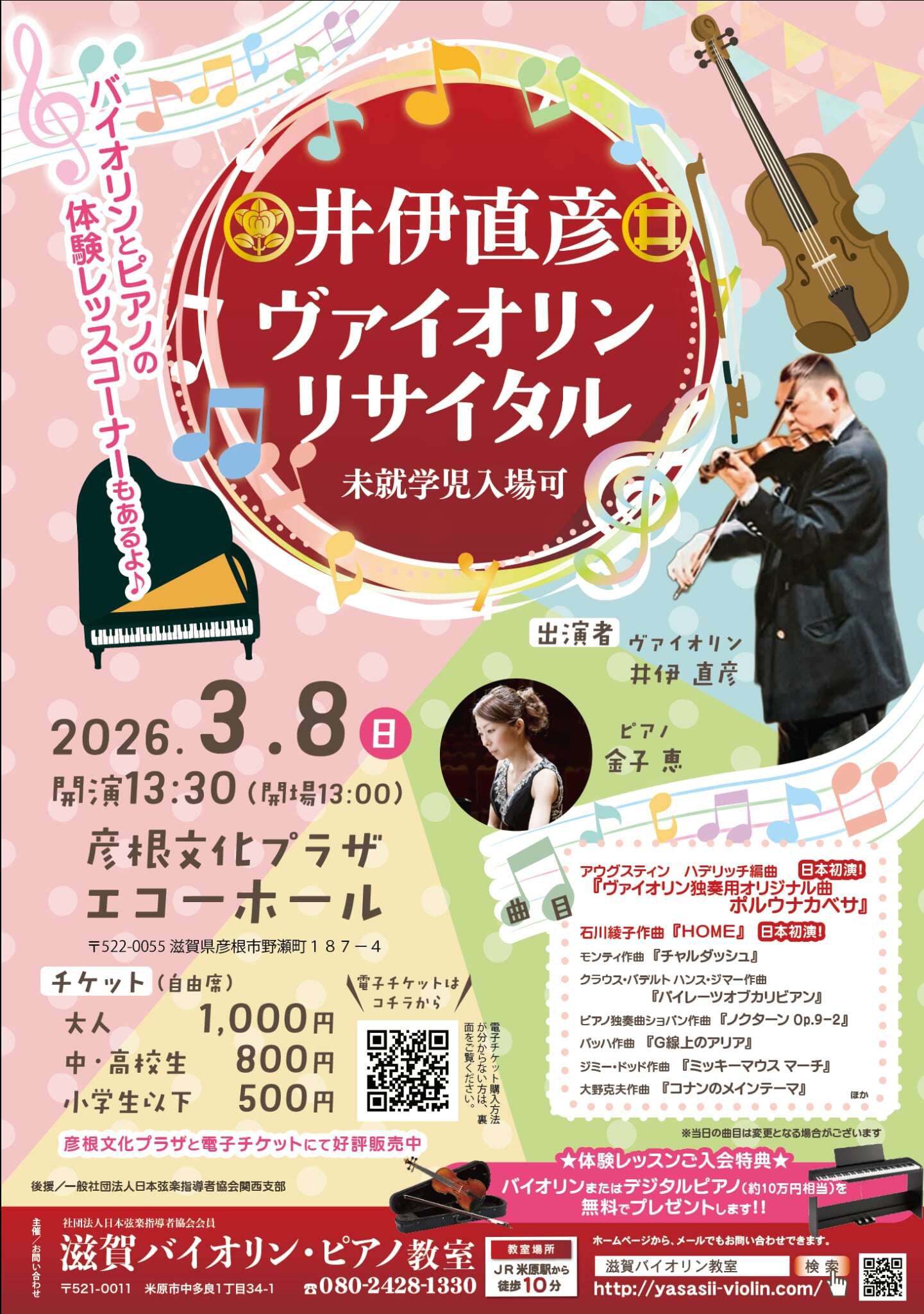 •滋賀バイオリン•ピアノ教室に入会される方が対象となります。(通常は入会金5,000円を頂いていますが、コンサートに来て頂いた方は無料とさせて頂きます!